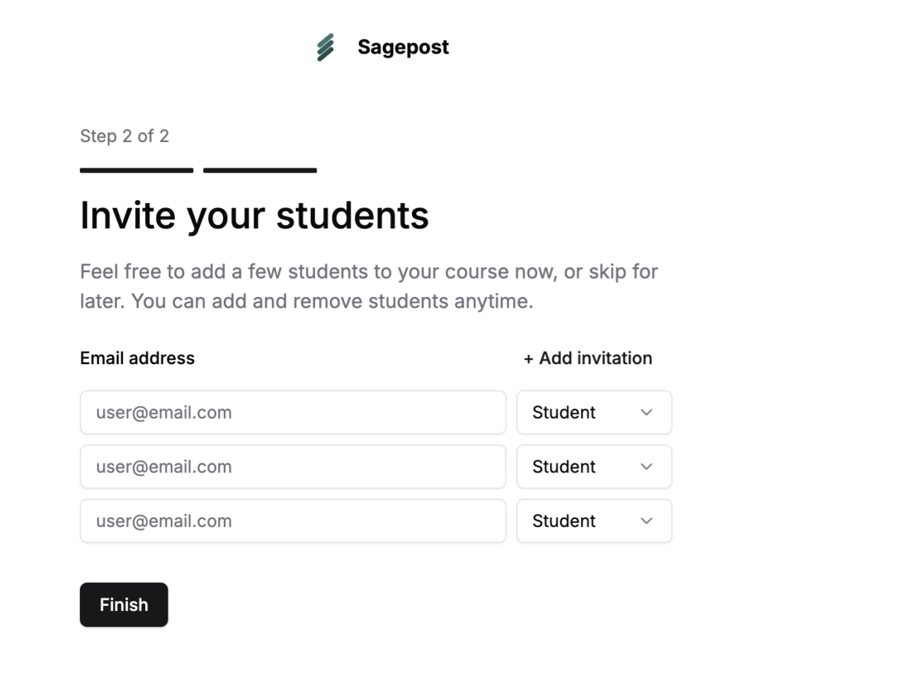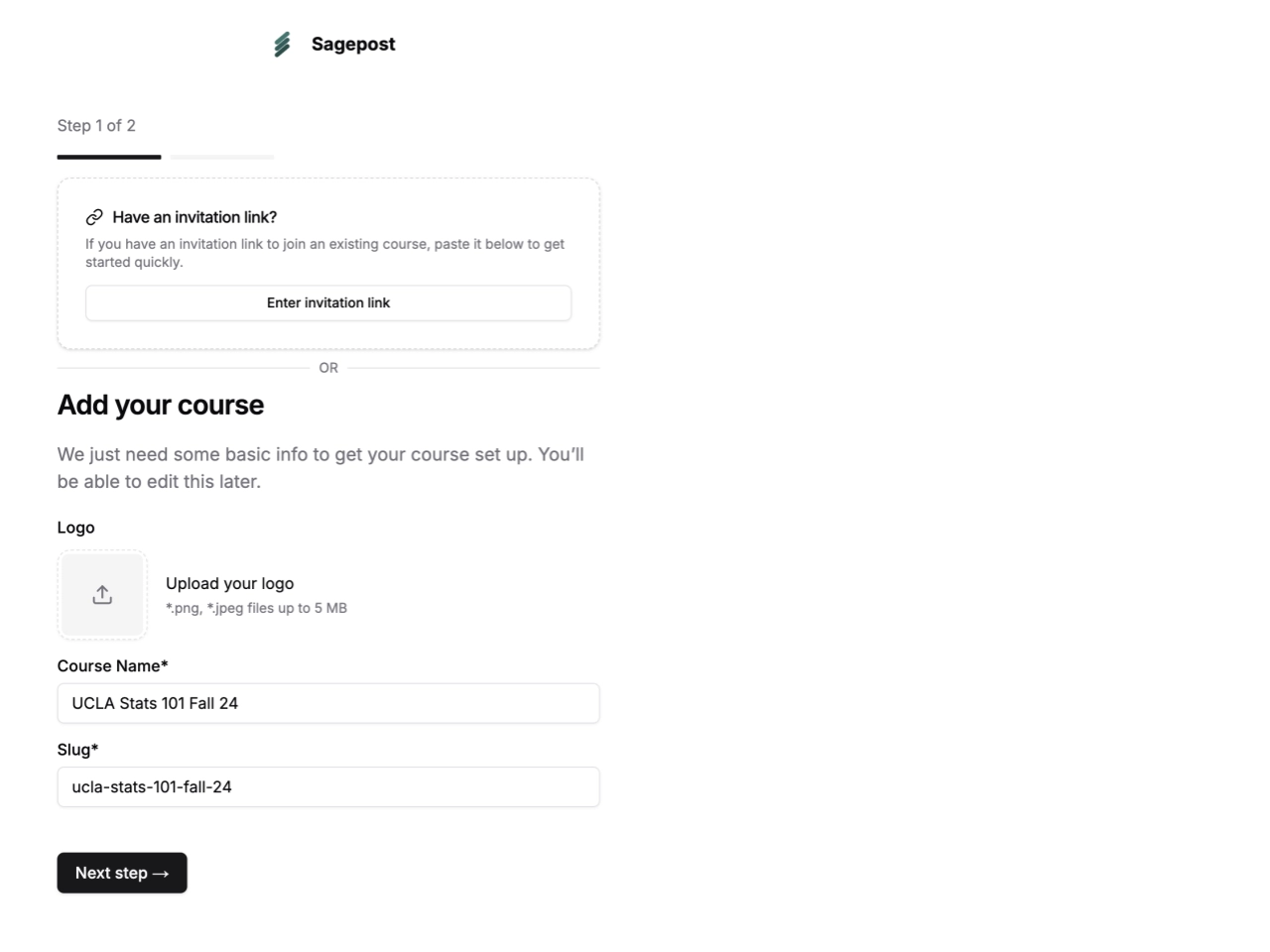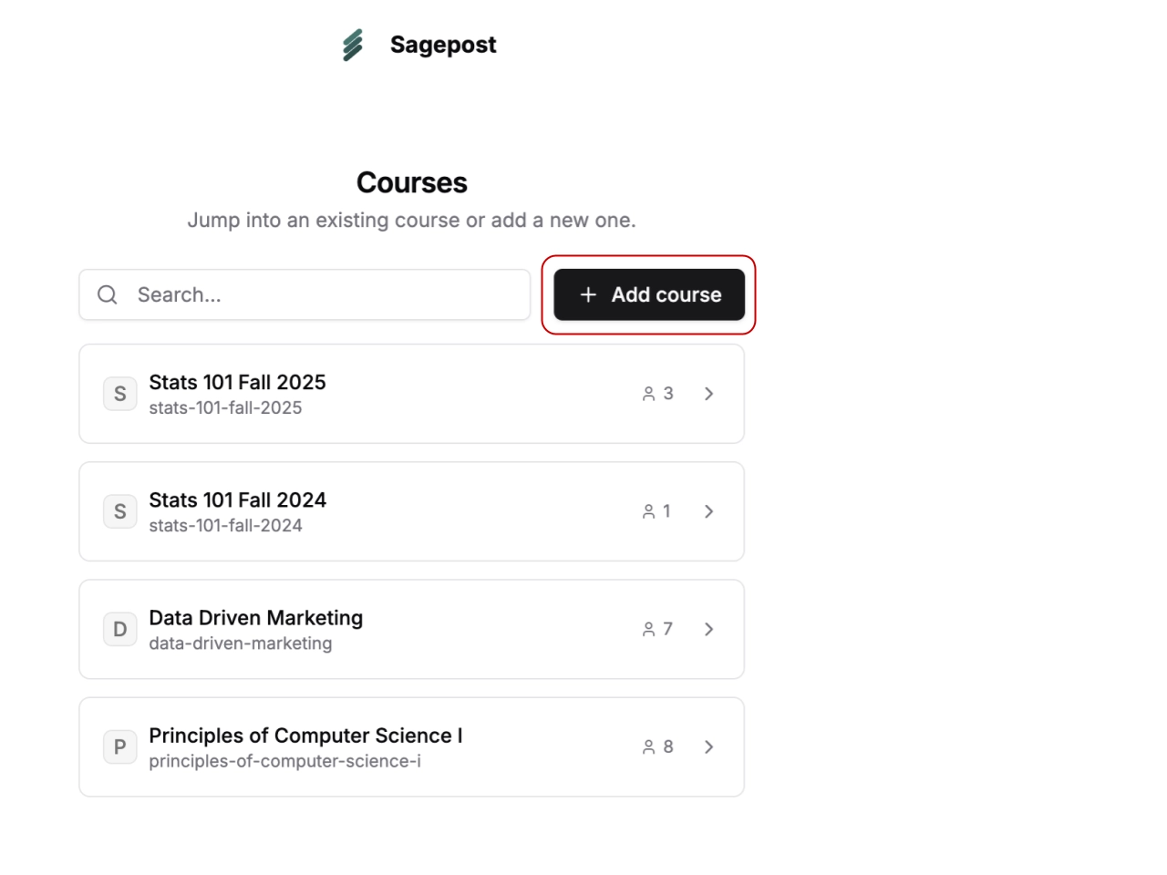 When the instructor first logs in to Sagepost, they are brought to their list of courses. To create a new course, the instructor simply clicks “Add Course,” which initiates the onboarding process.