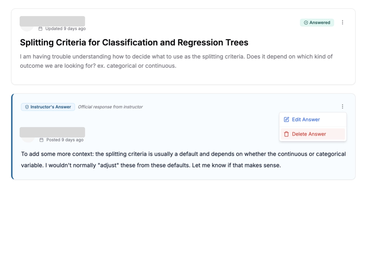 Instructors can delete posted questions, or edit and delete their own responses, by selecting the vertical ellipses in the upper right-hand corner of the response section.