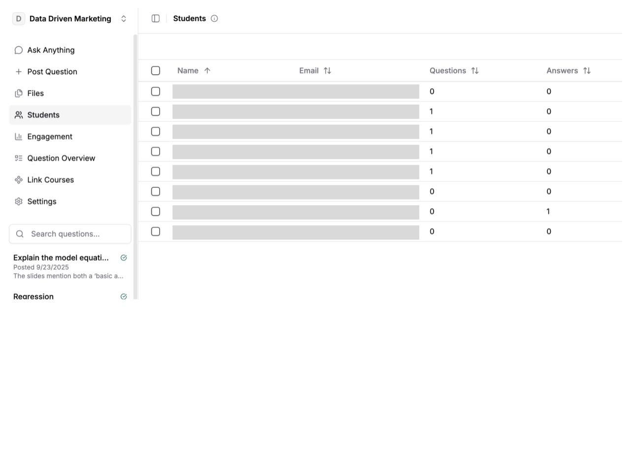 The “Students” pane provides a quick overview of class members, along with the number of questions and answers each student has contributed. Instructors can select students and download this information in Excel or CSV format.