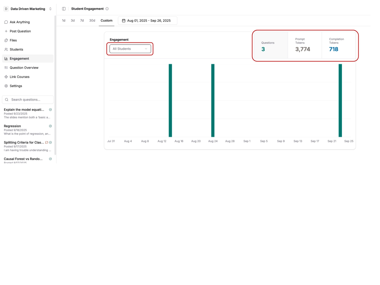 In the “Engagement” section, the instructor can view the following metrics across a date range of their choosing: