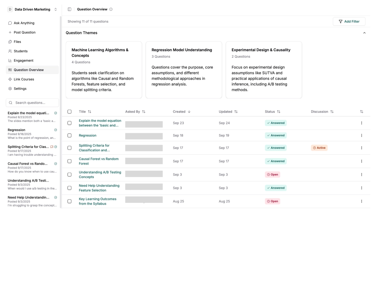 The “Question Overview” menu item offers a quick, detailed look at the states of all questions, sorted in descending date. This helps the instructor quickly identify open questions or active follow-up discussions that still require attention.