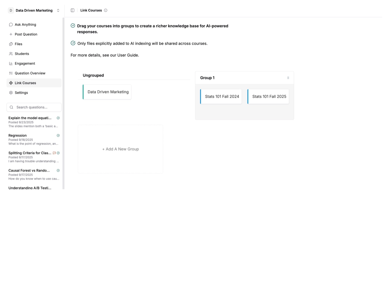 Courses are grouped by dragging their names into the same group. When courses are linked, any questions in one course will use the files and Q&A from the linked courses when crafting AI answers.