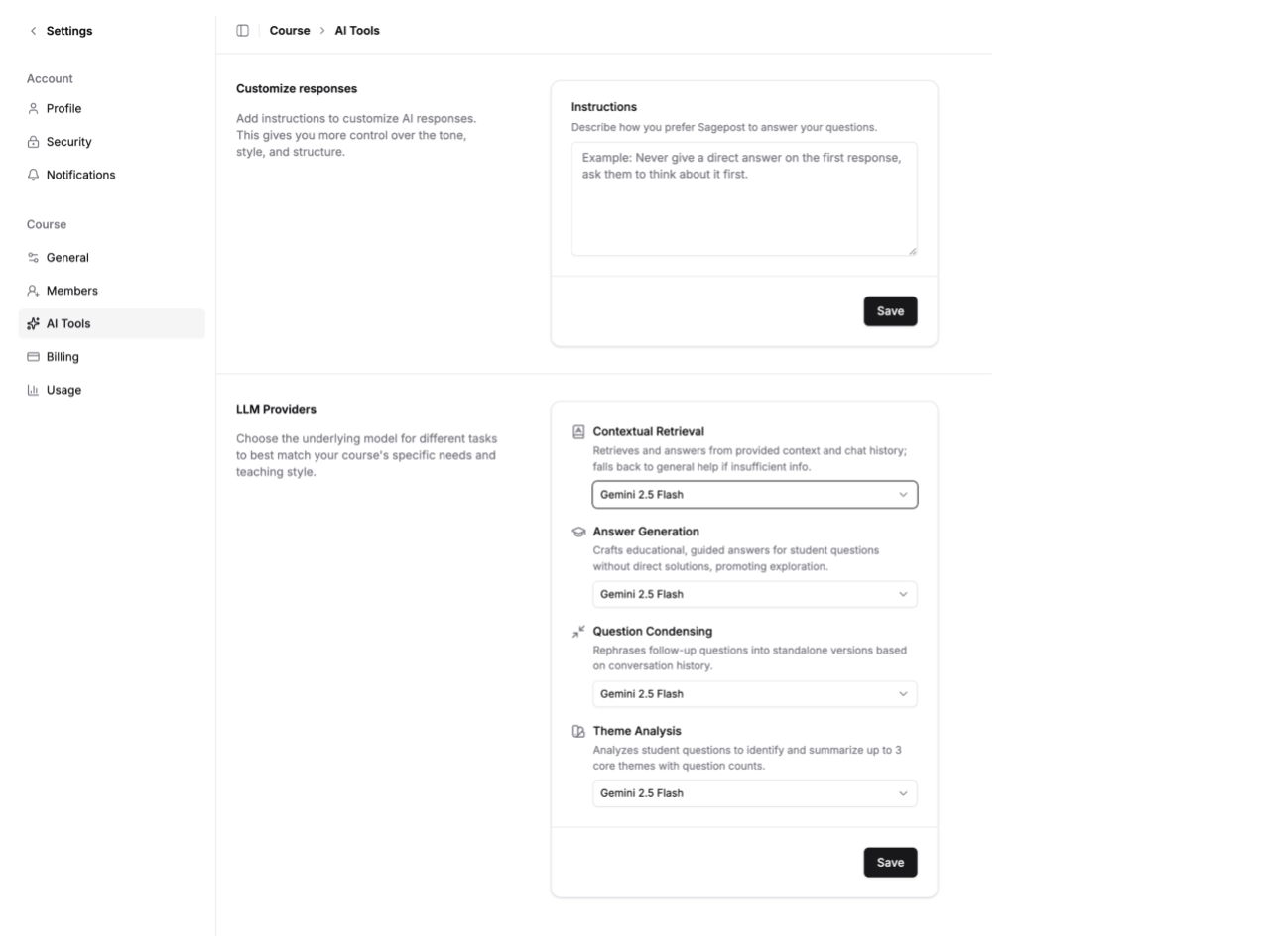 - LLM Providers: Allows the instructor to choose which model to use under different scenarios. While base models often perform well, the instructor may experiment with more advanced models. Note that more advanced models may consume tokens at a faster, more costly rate.