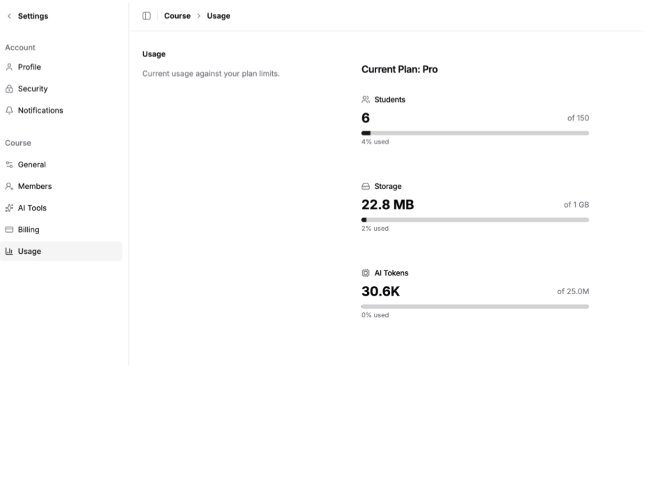 The “Usage” section indicates the instructor's proximity to their tier capacities. AI token usage resets at the end of the subscription period,.