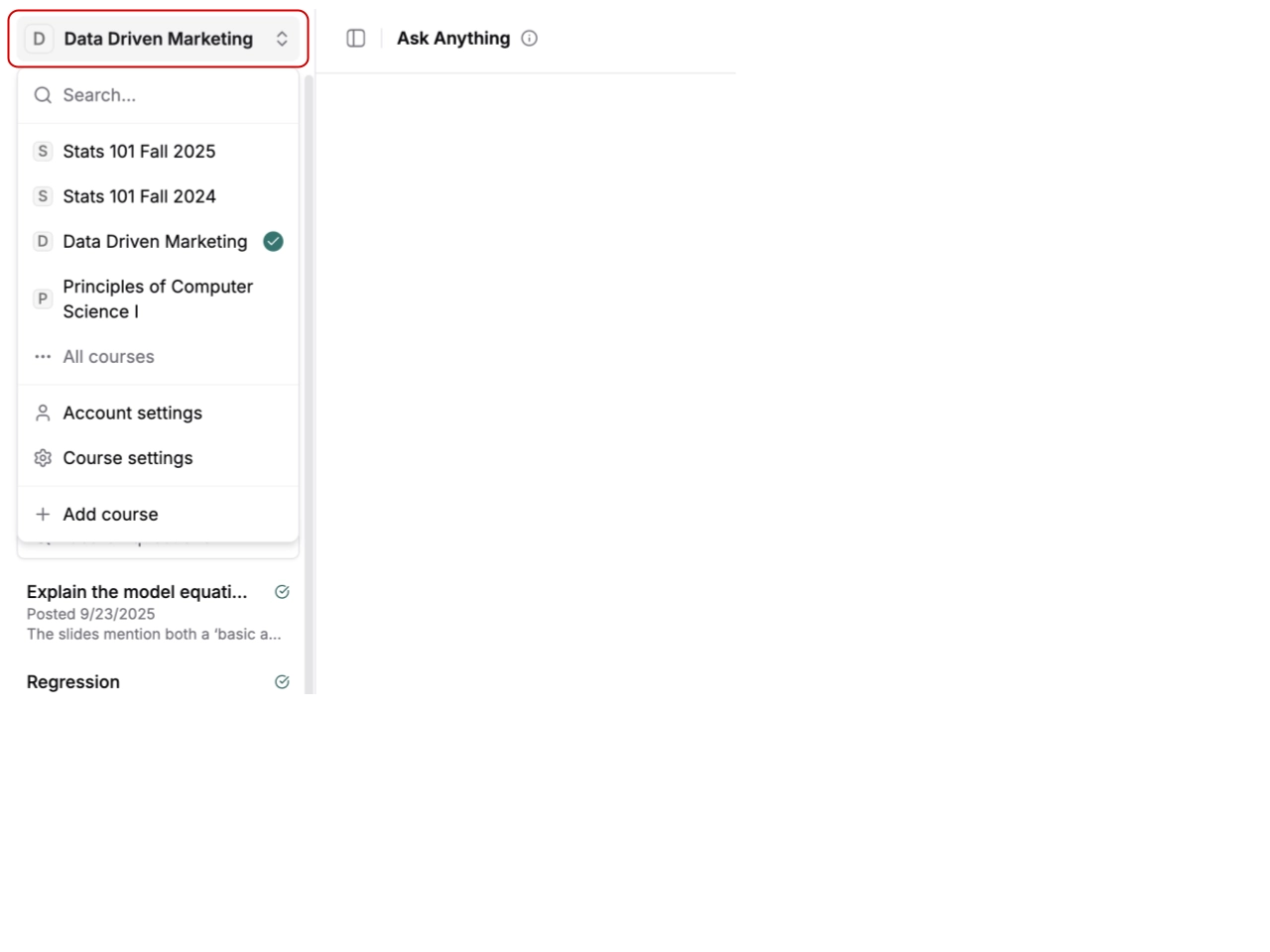 After the course is created, the instructor can navigate between all their courses by clicking on the course name in the top-left corner.