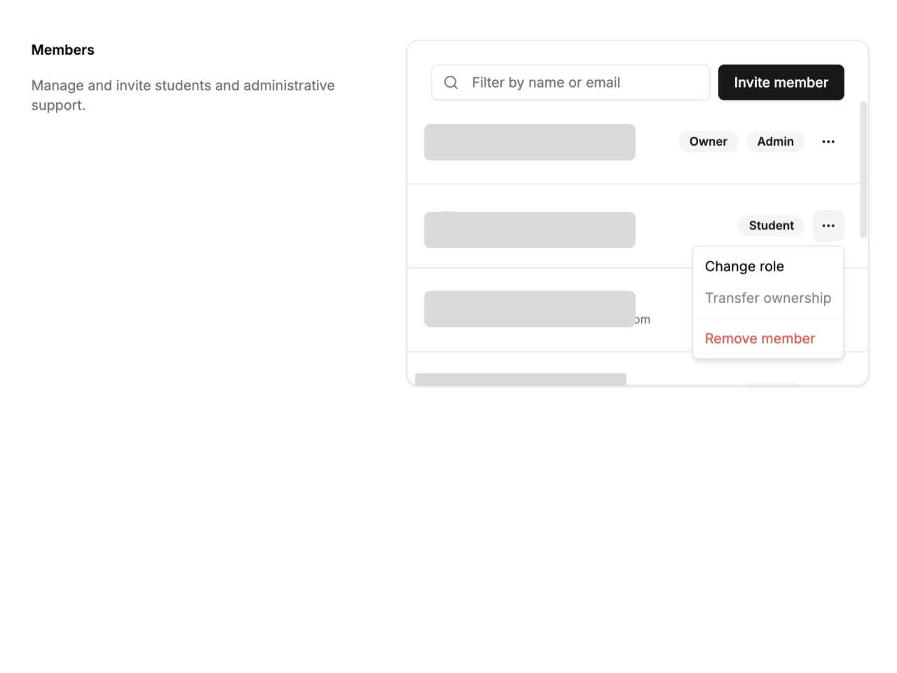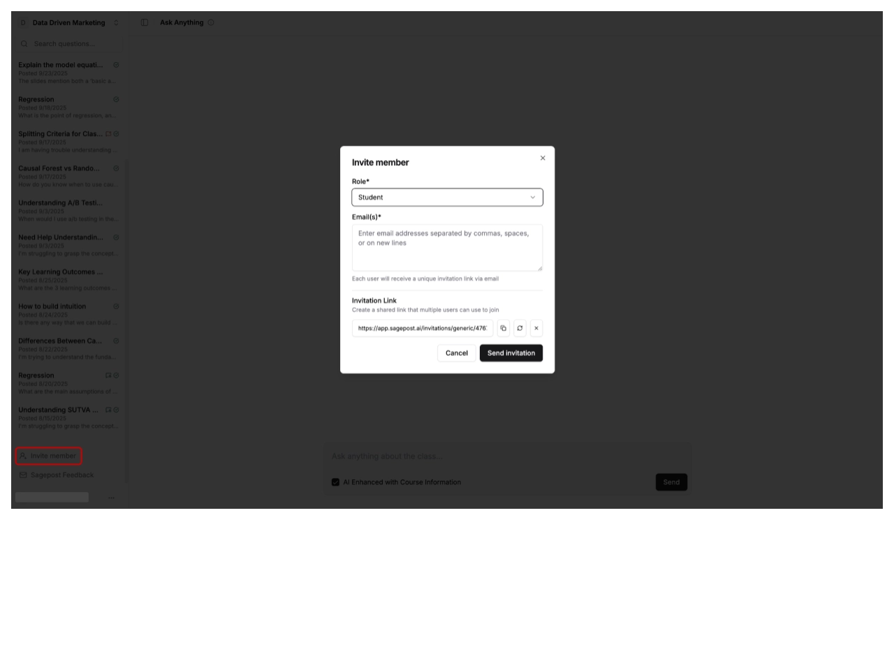 Both roles can be added either under Course Settings → Members or by clicking “Invite Member” in the bottom of the left pane.