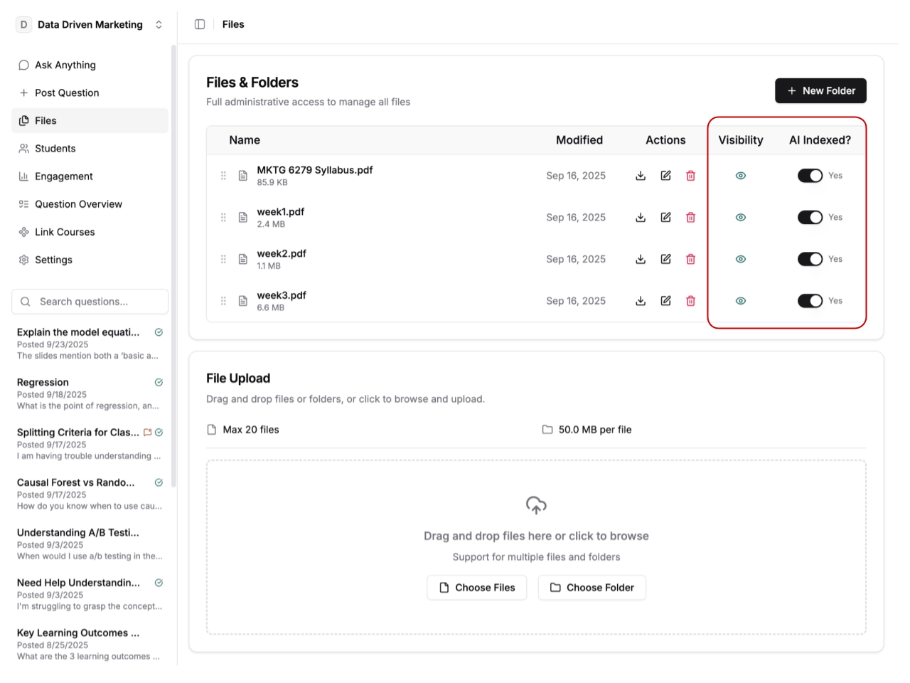 For example, an instructor might share a file with students (Visibility ON) but not want it indexed for retrieval (AI Indexing OFF), such as slides for an upcoming lecture where in-person attendance is preferred before students begin asking questions.