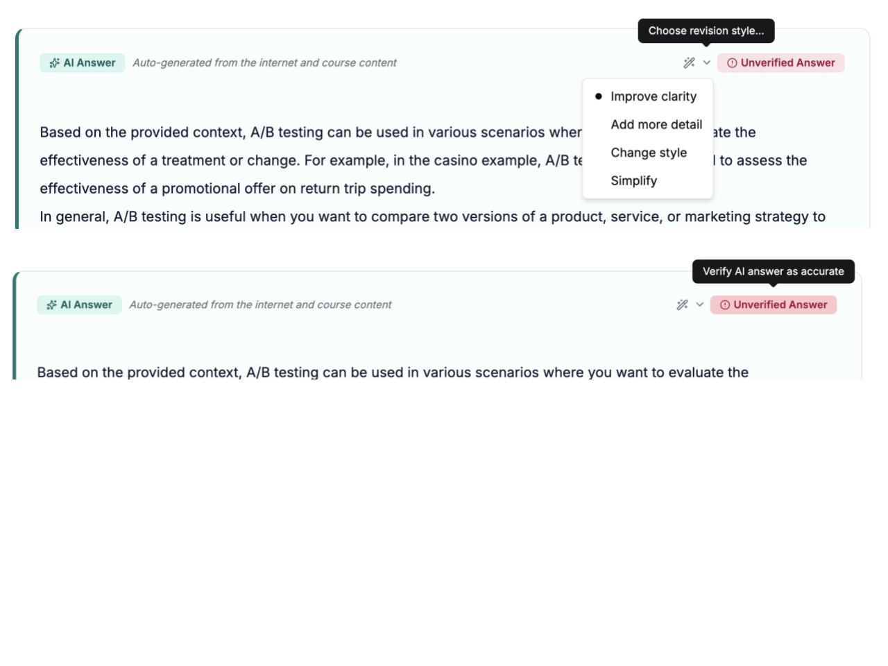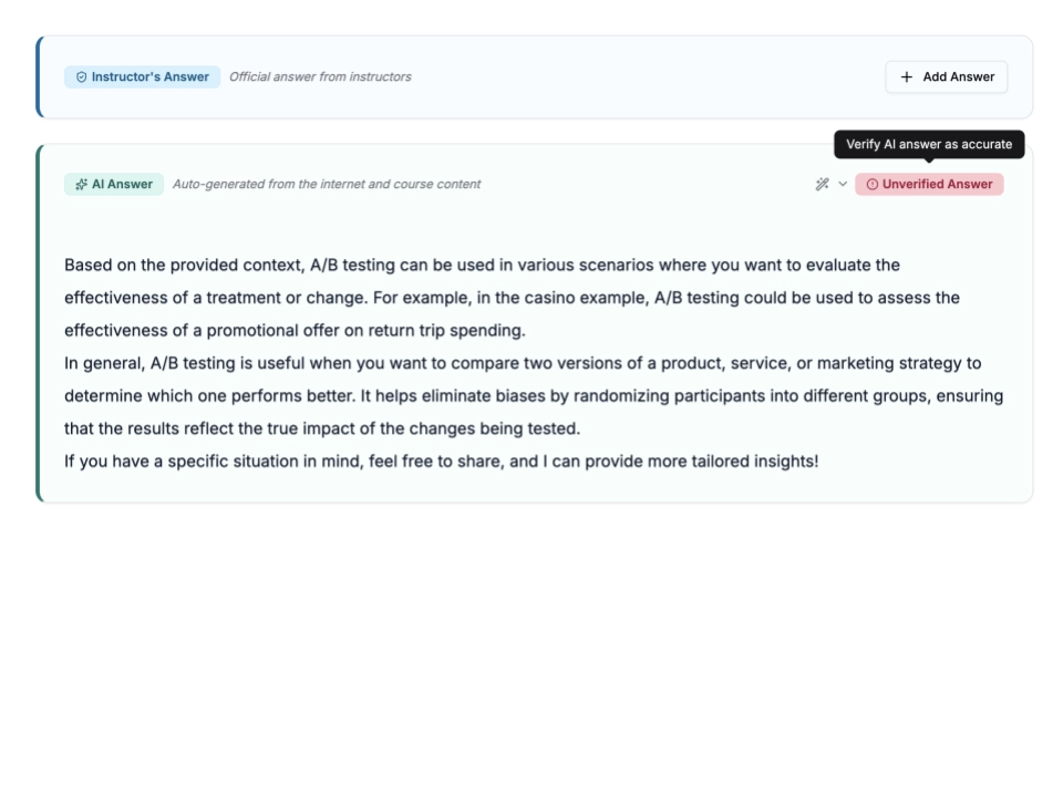 Once satisfied, verifying the answer sends an update to the students. If the AI answer remains insufficient, the instructor should add their own custom answer and leave the AI answer unverified to indicate to students that the automated response is not satisfactory.